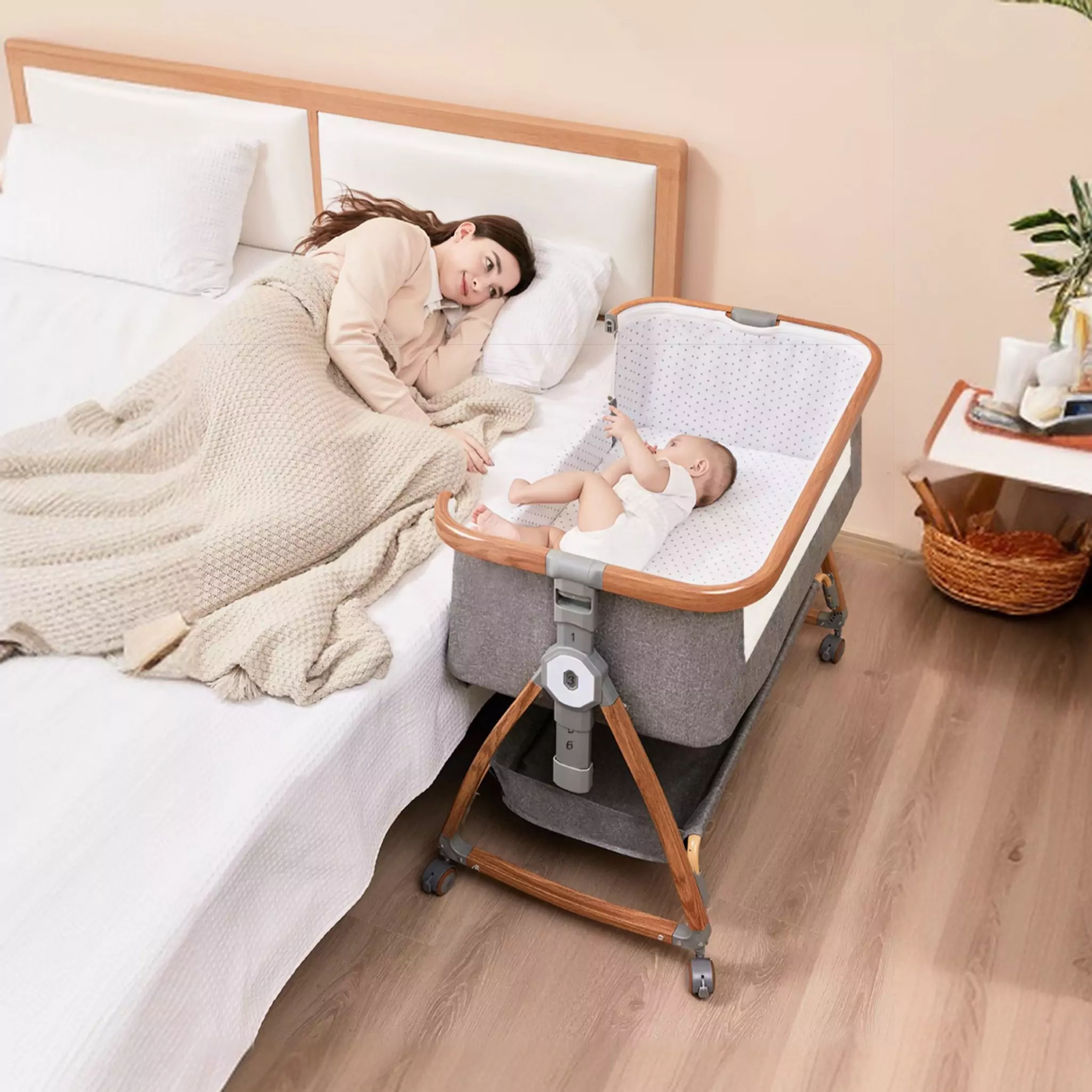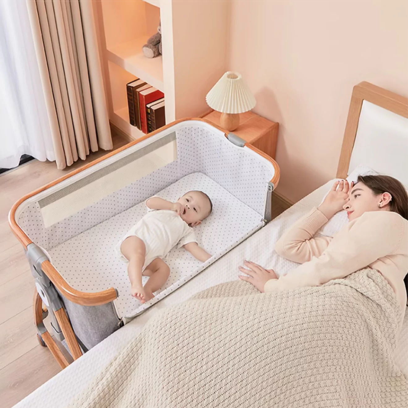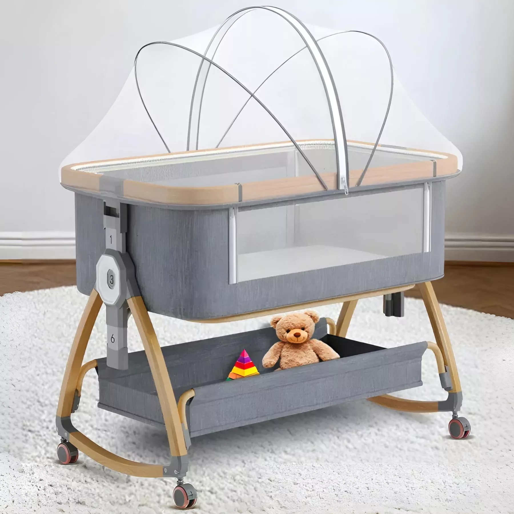 Це ліжечко для немовлят дає змогу завжди бути поруч із дитиною. Ви можете годувати малюка вночі, не встаючи з ліжка, а функція нахилу допомагає уникнути зригувань. Коліщатка забезпечують легке переміщення, а москитна сітка робить сон спокійним навіть у літній період.