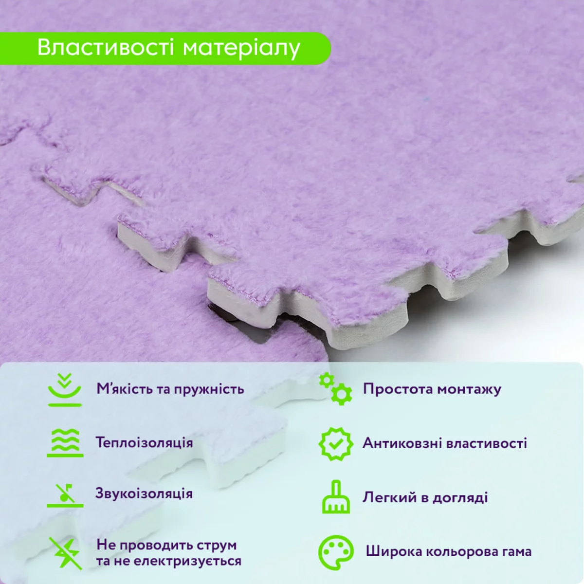 Фіолетовий плюшевий килимок-пазл додає інтер’єру ніжного кольорового акценту, робить підлогу теплішою та м’якшою. Приємний на дотик плюш і EVA-основа з антиковзним тисненням забезпечують комфорт, теплоізоляцію та стійкість покриття. Модулі 30×30 см легко поєднувати паз-замками та комбінувати з іншими кольорами.
